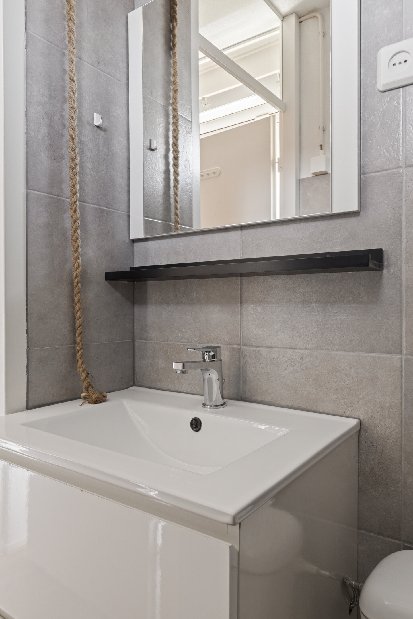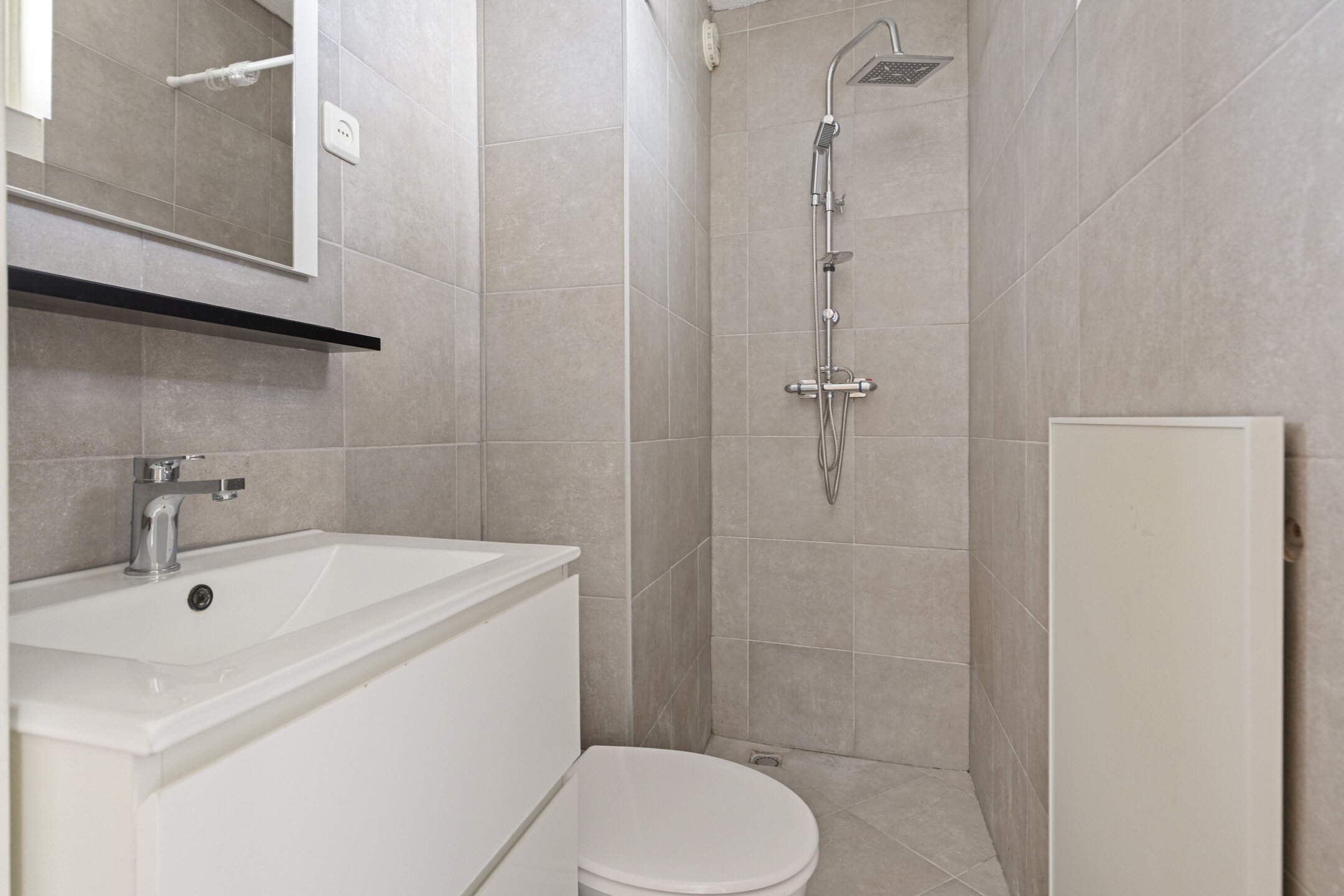 De moderne badkamer is netjes afgewerkt en voorzien van een douche, toilet en wastafelmeubel.