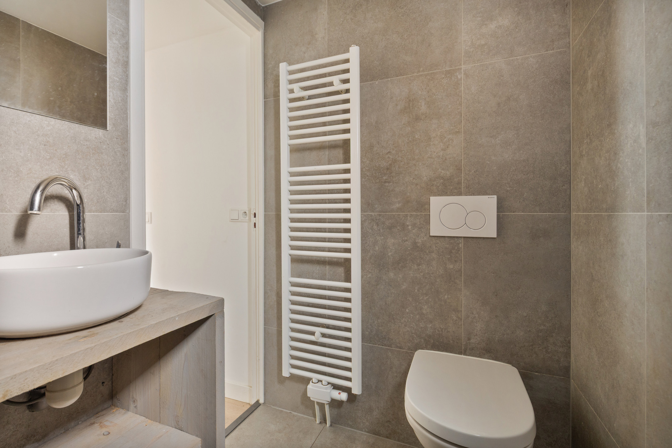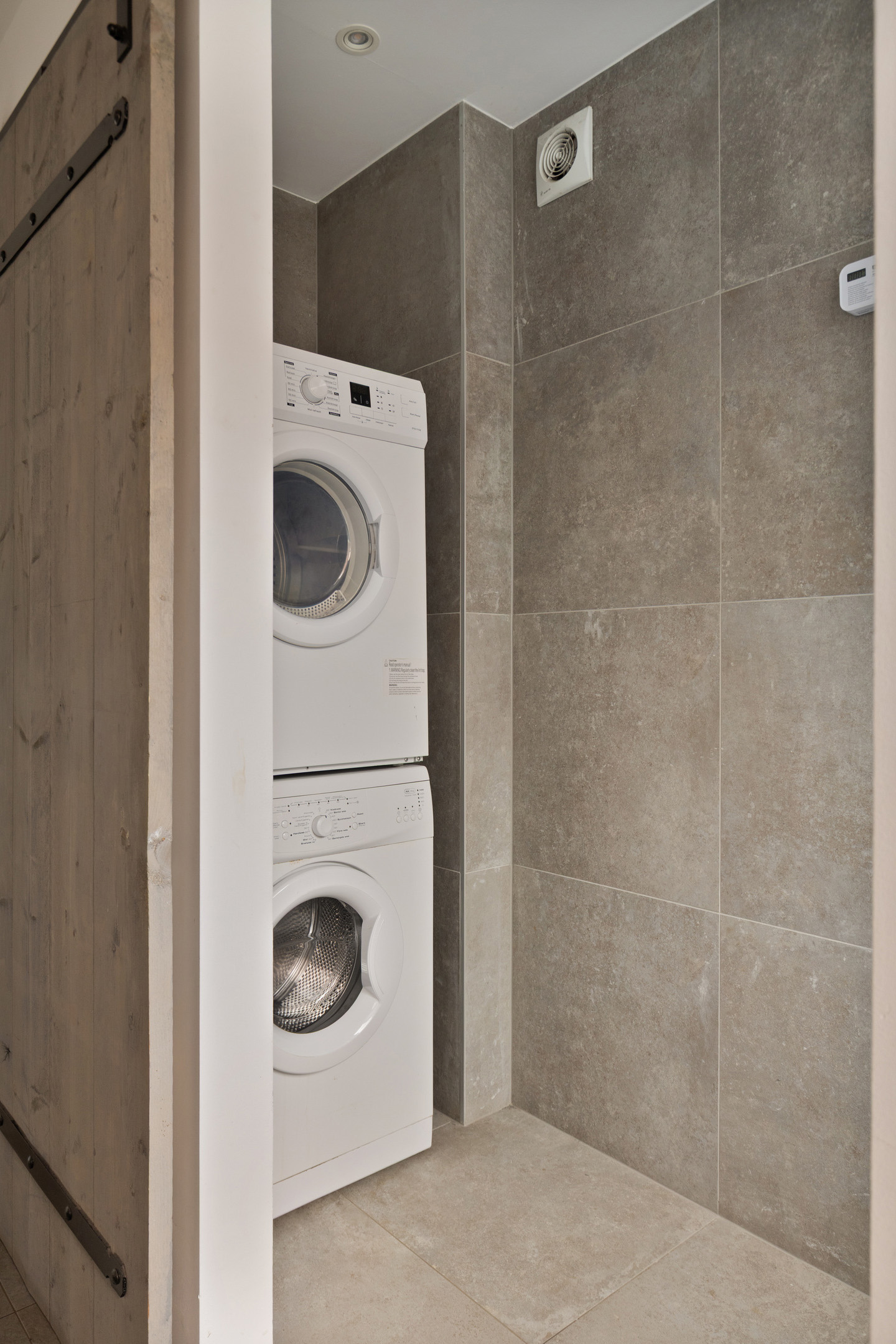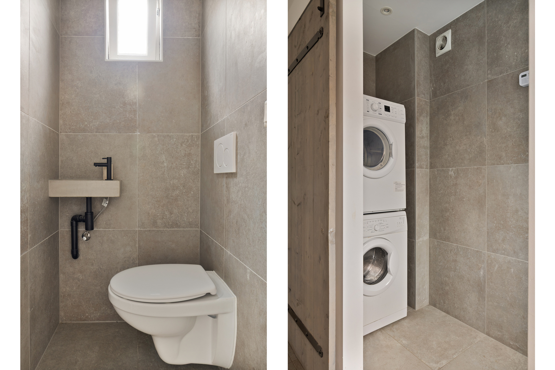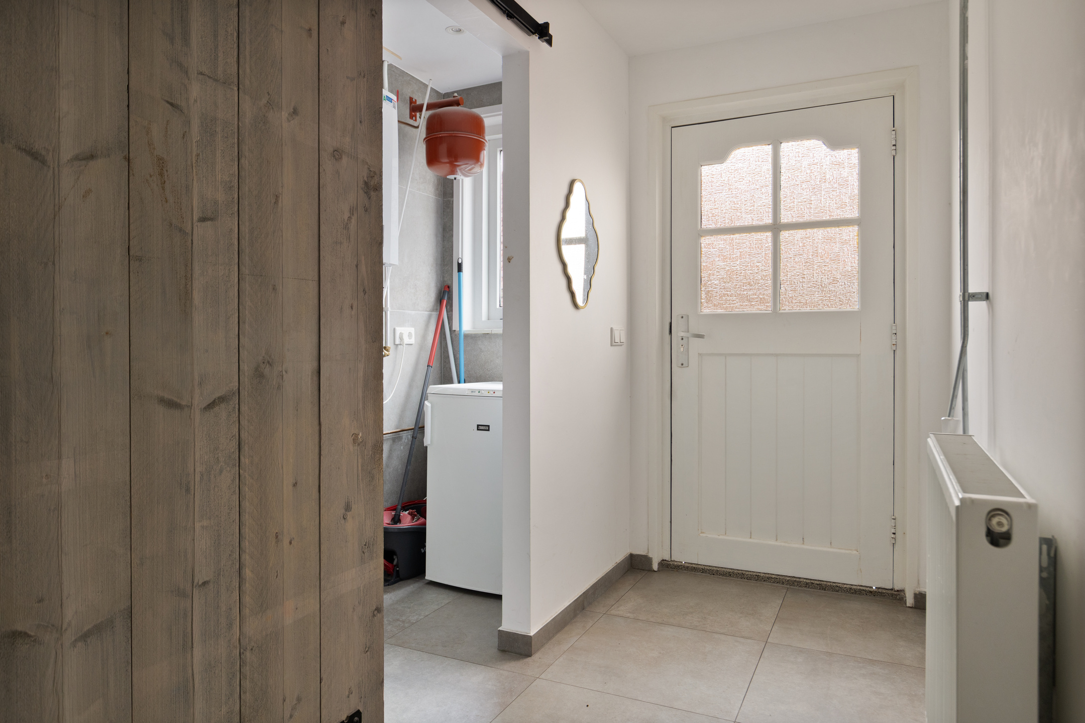 Aansluitend de tussenhal, waar het gemoderniseerde toilet met handwasbakje en de wasruimte met wasmachine/droger opstelling. De c.v. ketel (Remeha 2022) bevindt zich hier ook. Deze ruimte wordt afgesloten middels een praktische schuifdeur van steigerhout. De keuken- en bijkeukenvloer zijn voorzien van een warme moderne grijsachtige vloertegel.