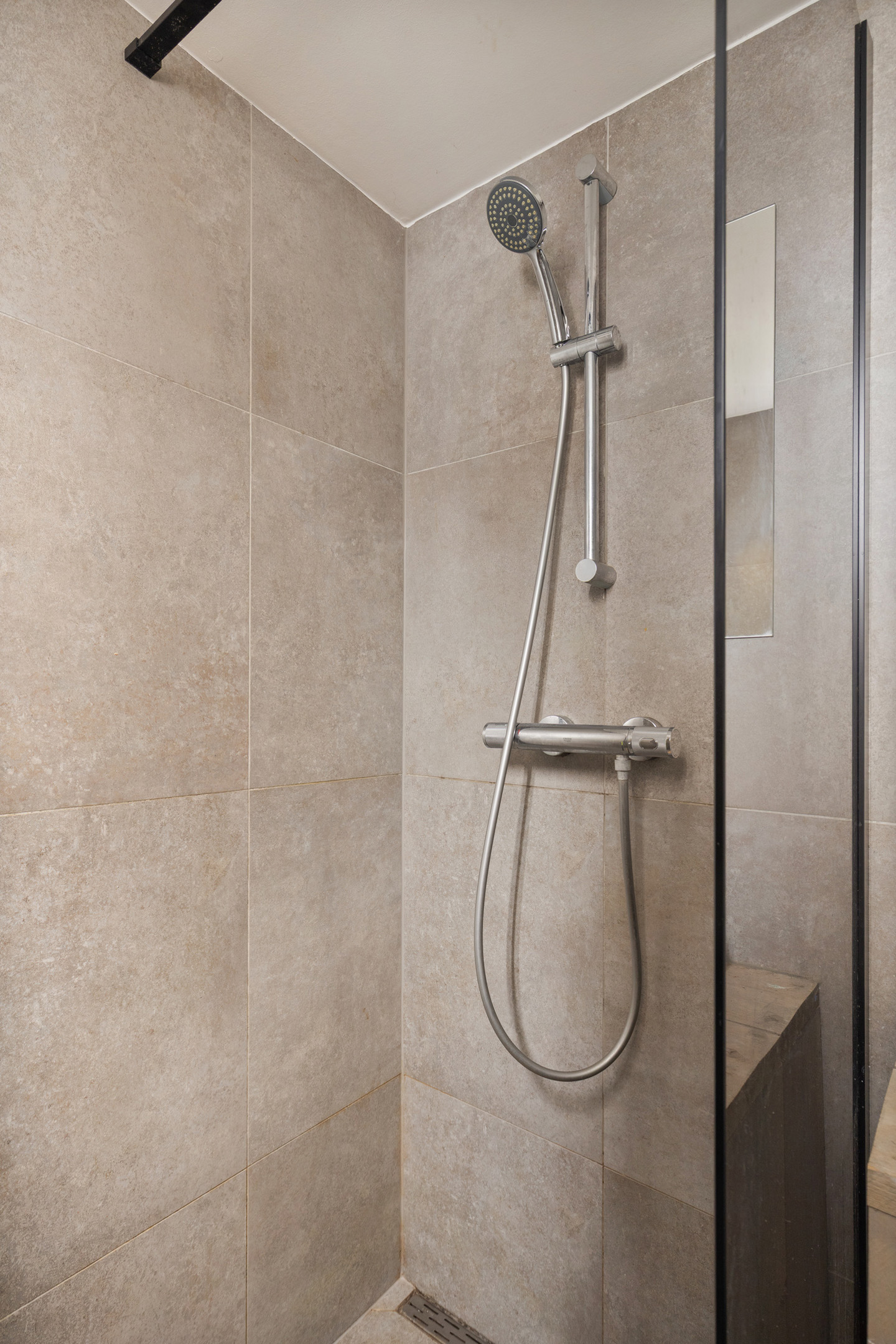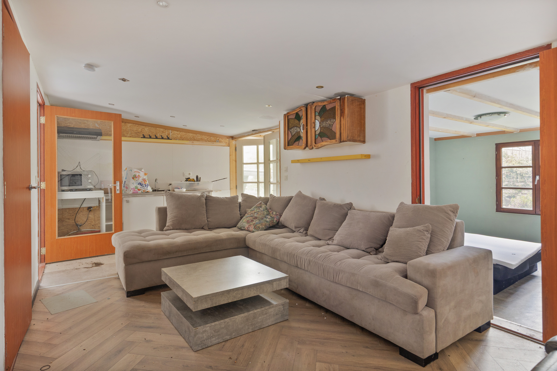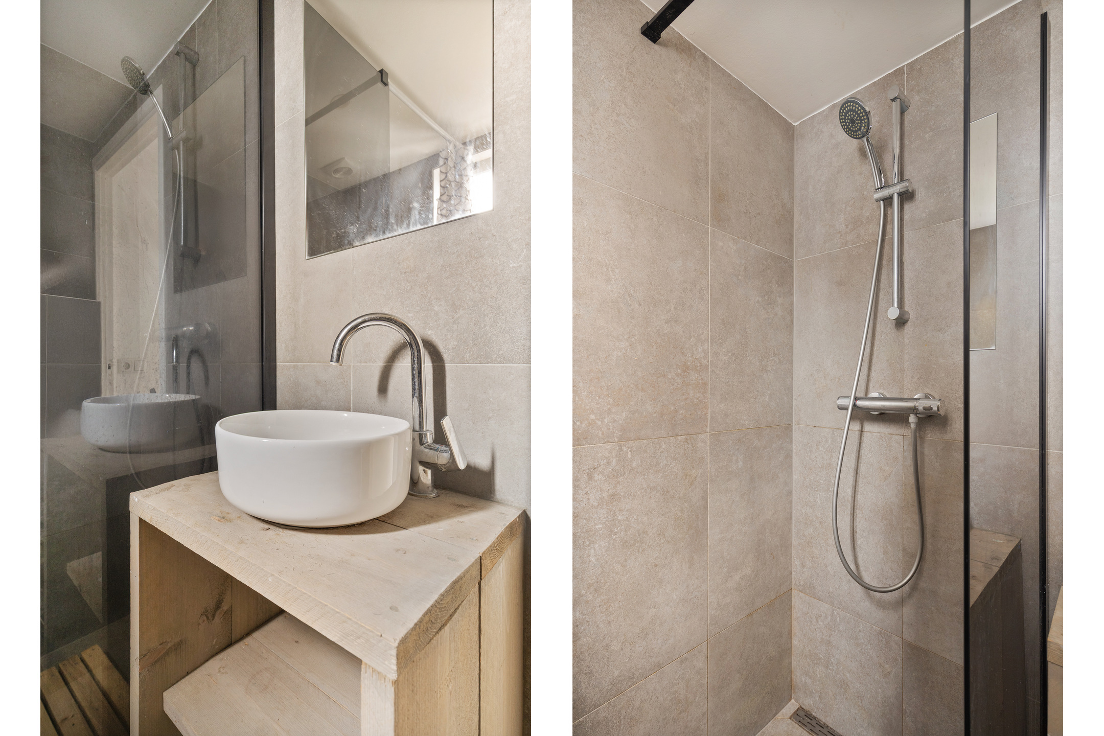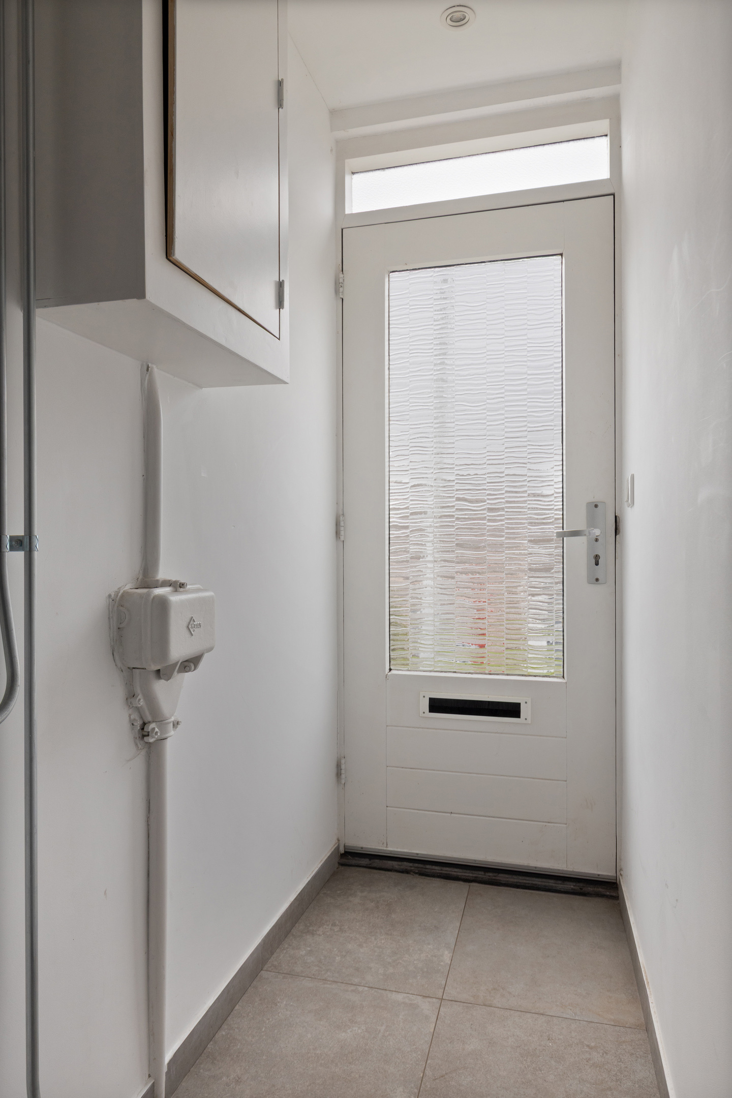 Aansluitend de tussenhal, waar het gemoderniseerde toilet met handwasbakje en de wasruimte met wasmachine/droger opstelling. De c.v. ketel (Remeha 2022) bevindt zich hier ook. Deze ruimte wordt afgesloten middels een praktische schuifdeur van steigerhout. De keuken- en bijkeukenvloer zijn voorzien van een warme moderne grijsachtige vloertegel.