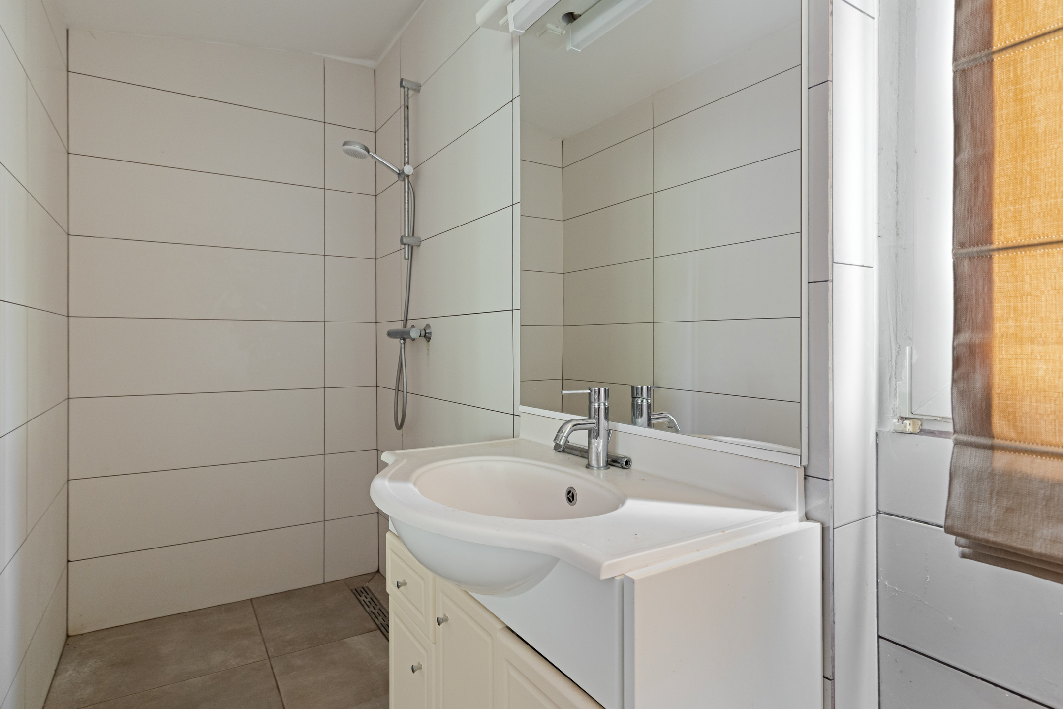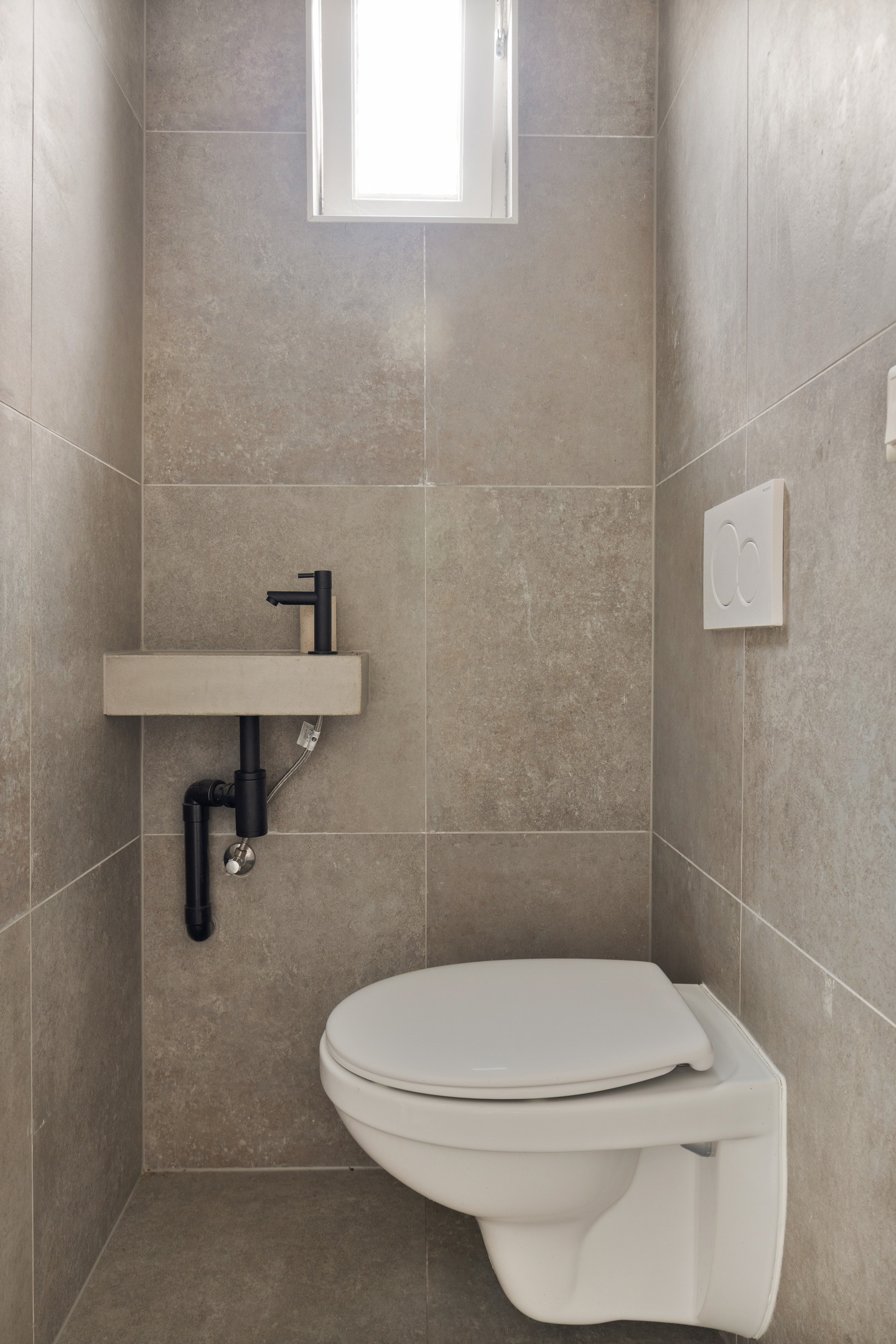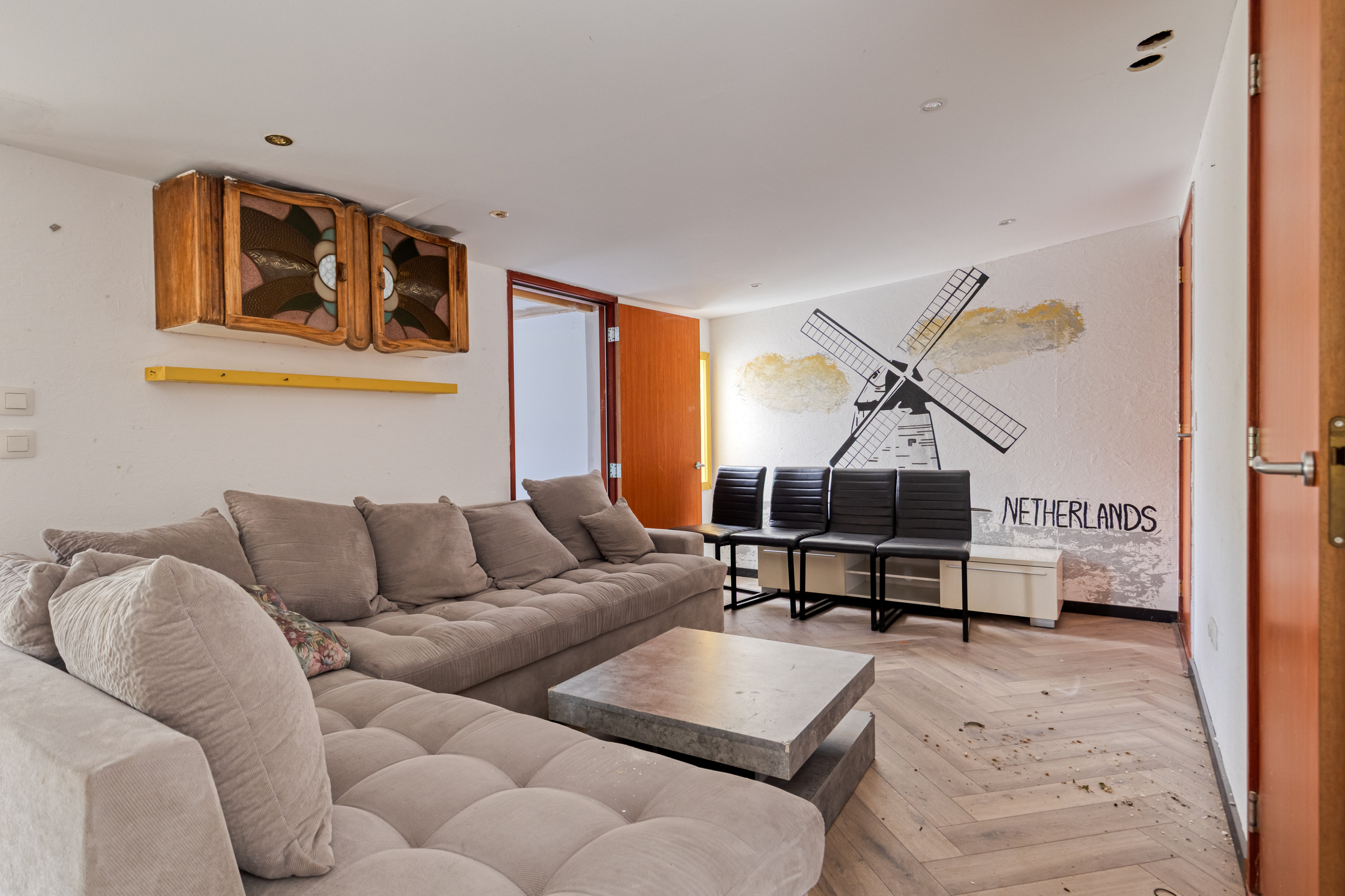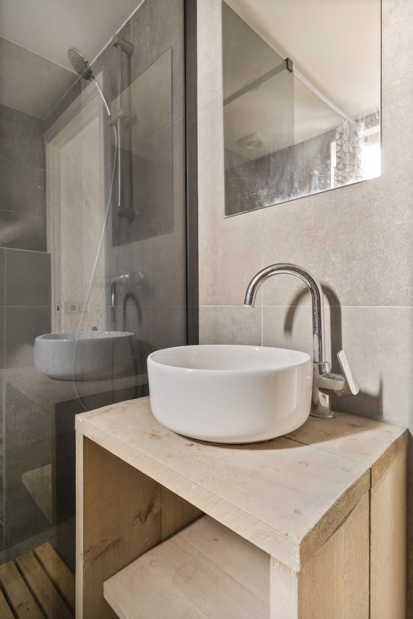 Aansluitend de tussenhal, waar het gemoderniseerde toilet met handwasbakje en de wasruimte met wasmachine/droger opstelling. De c.v. ketel (Remeha 2022) bevindt zich hier ook. Deze ruimte wordt afgesloten middels een praktische schuifdeur van steigerhout. De keuken- en bijkeukenvloer zijn voorzien van een warme moderne grijsachtige vloertegel.